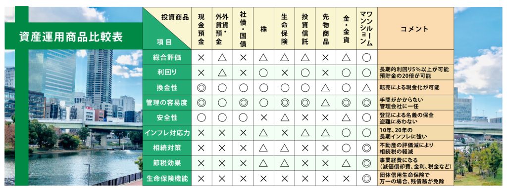 上の表をご覧いただいた様に現状、預金などは利回りが低くペイオフにより安全性までも不安になってきました。さらにその他の金融商品もハイリスクを伴い、細心の注意が必要です。その中で再ブームを迎えているのが「ワンルームマンションの経営」です。不動産の価格は買いやすくなりましたが、都心の家賃収入は安定しており5%以上の安定利回りが得られます。その上、所得税や住民税、相続税対策にもなります。