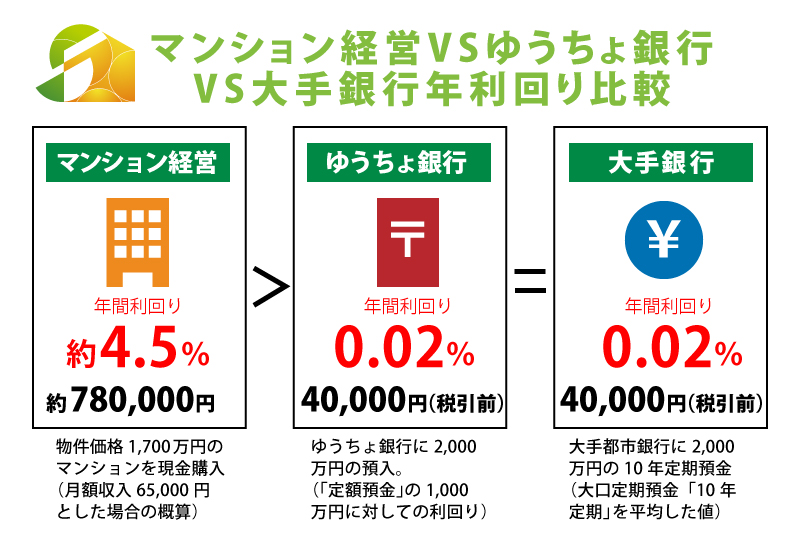 ワンルームマンションを現金で購入した場合、年間約70万円以上の賃料収入が見込めますので、利回りに換算すると約4%以上になります。今の低金利時代に資産分散のひとつとして有効な投資先といえます。