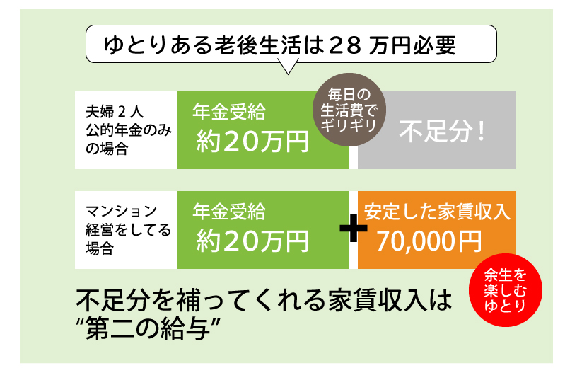 リタイヤした後はのんびりゆったり悠々自適の年金生活。誰もが思い描いていた老後生活の理想が今、大きく崩れようとしています。公的年金制度が破綻寸前の危機に陥り、もはや年金はあてにならない時代に。マンション経営は様々なメリットが有りローン完済後は収益となるため、私的年金としての役割が期待できます。