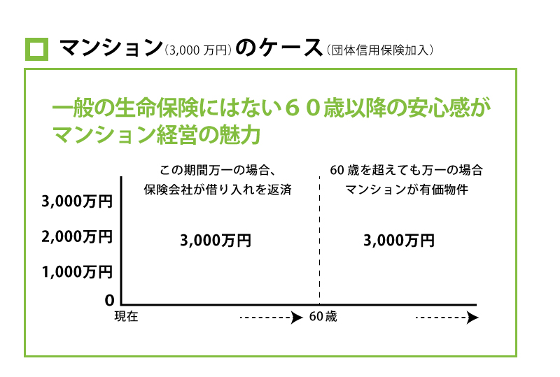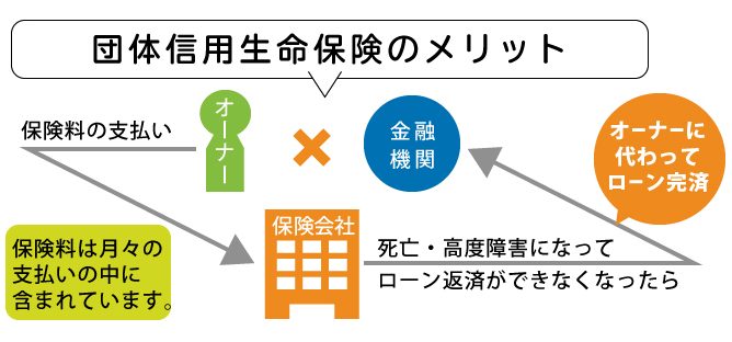 オーナー様が不幸にも死亡した場合や、高度障害になった場合に、住宅ローンの残りが支払われる保険です(加入に際して年齢の差異は有りません)万一の際には住宅ローンは保険金で完済され、ご家族に安定した家賃収入を生んでくれるマンションを残すことができます。生命保険と比較してもマンション経営には大きなメリットがあります。