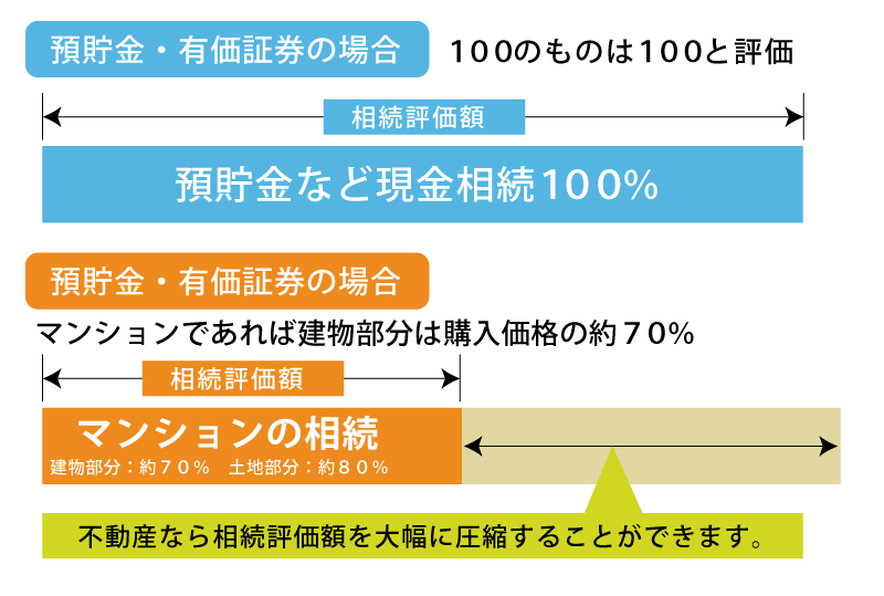 不動産の相続税評価は、建物部分が購入価格のおおむね70%程度で評価されることが多く、現金や金融資産と比べて大幅に圧縮できます。また賃貸することで、さらに評価を圧縮できますので相続税対策として非常に有効です。